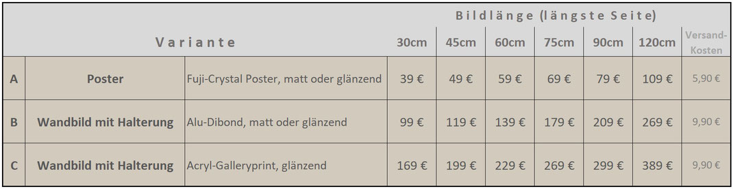 Die kurze Seite des Bildes variiert bei den angegebenen Längen, da ich in verschiedenen Formaten fotografiere. Gerne nenne ich vorab bei Interesse die genauen Abmessungen, sobald ich die gewünschte Länge kenne.